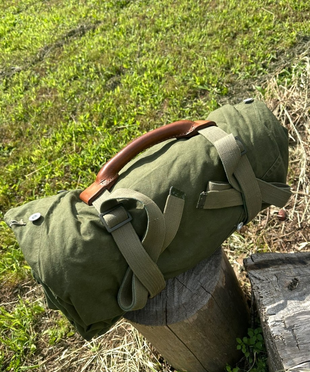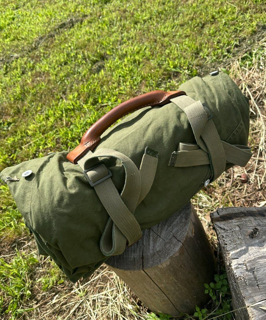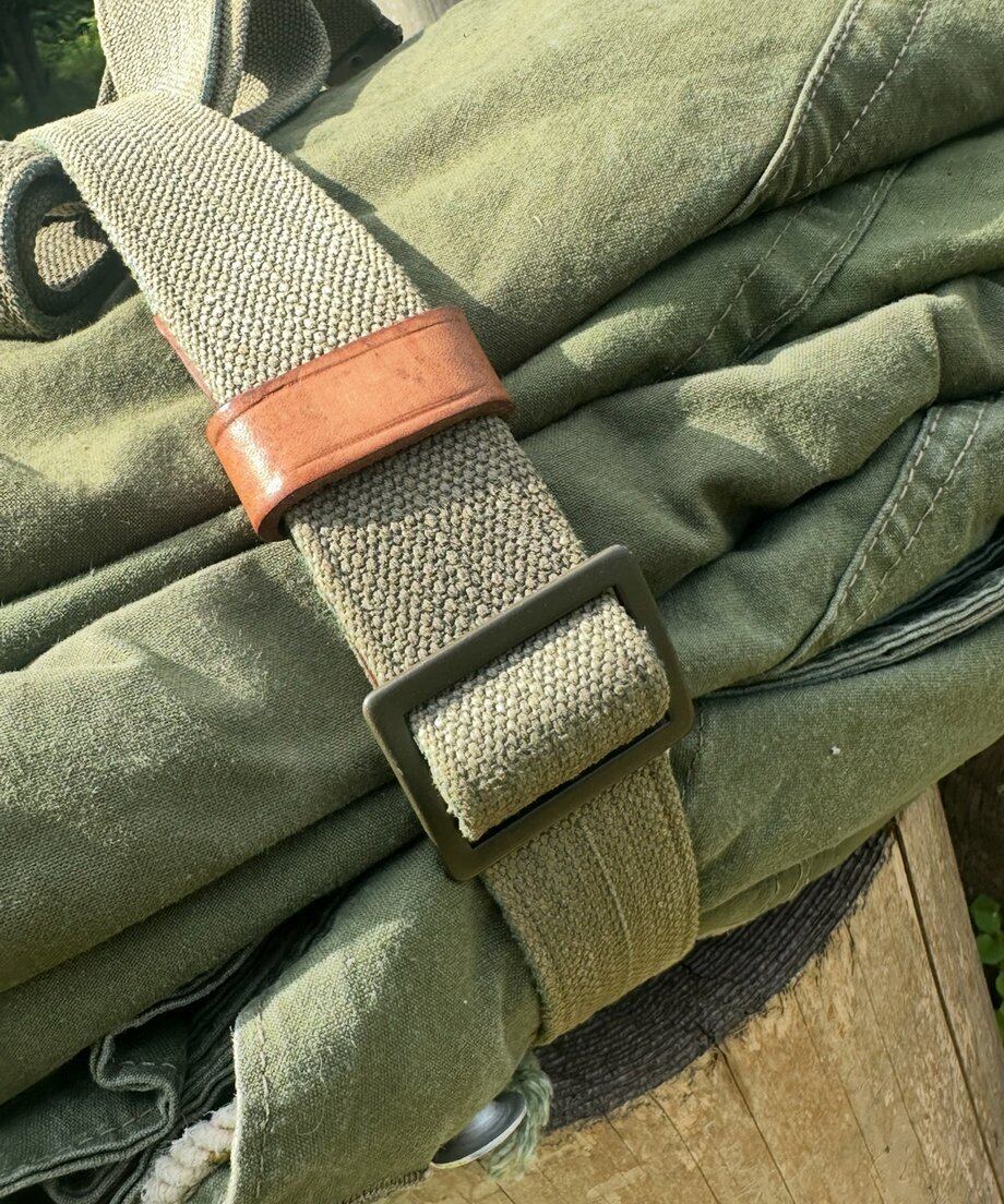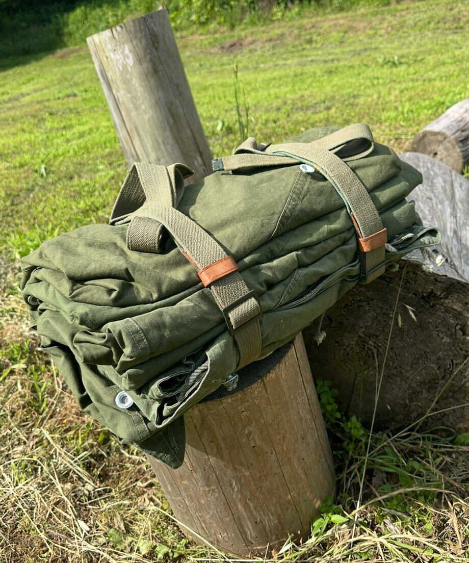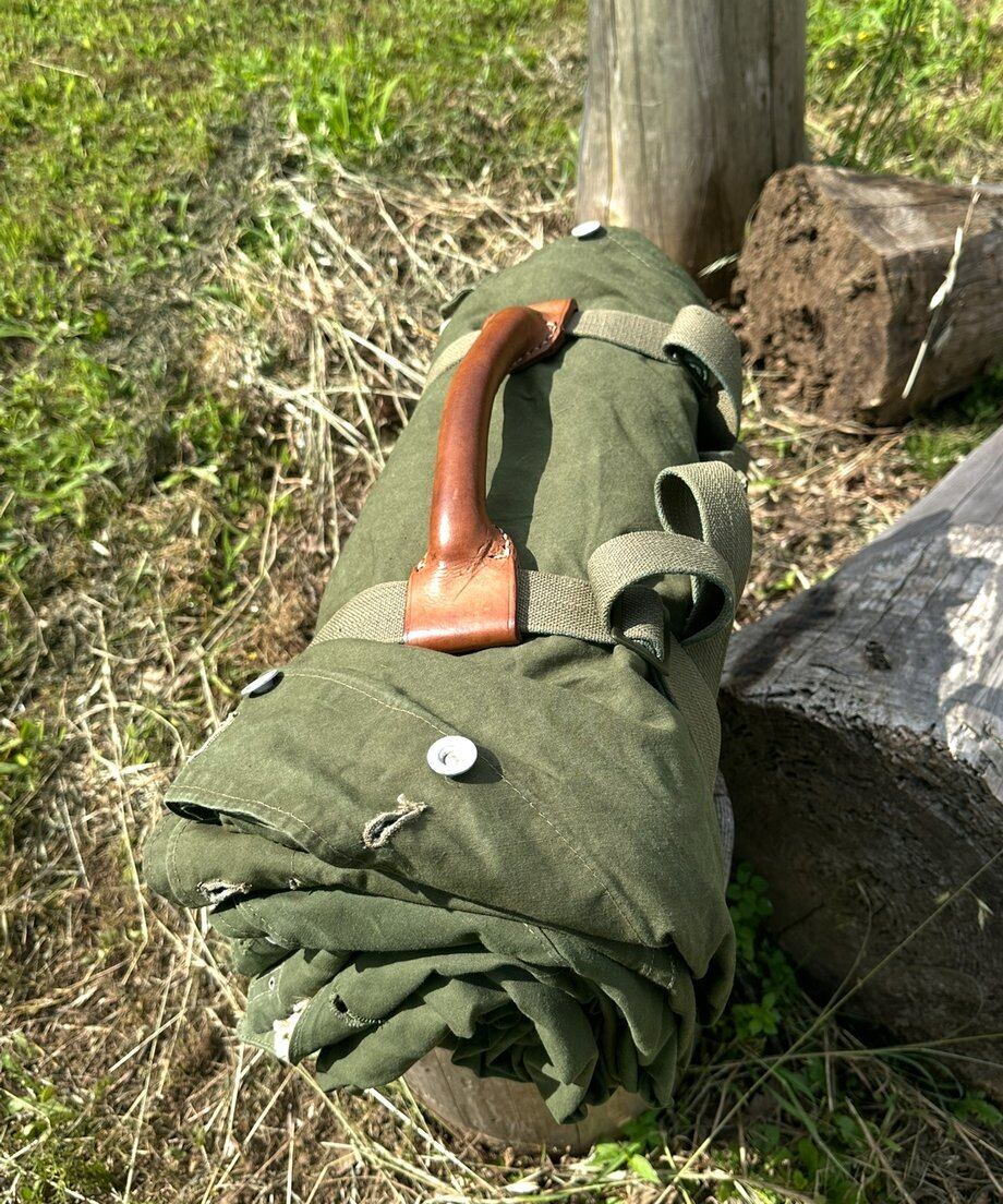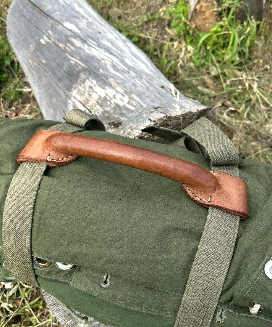 写真はノルウェー軍幕にレザーハンドルを取り付けたイメージです。商品はハンドルのみになります。