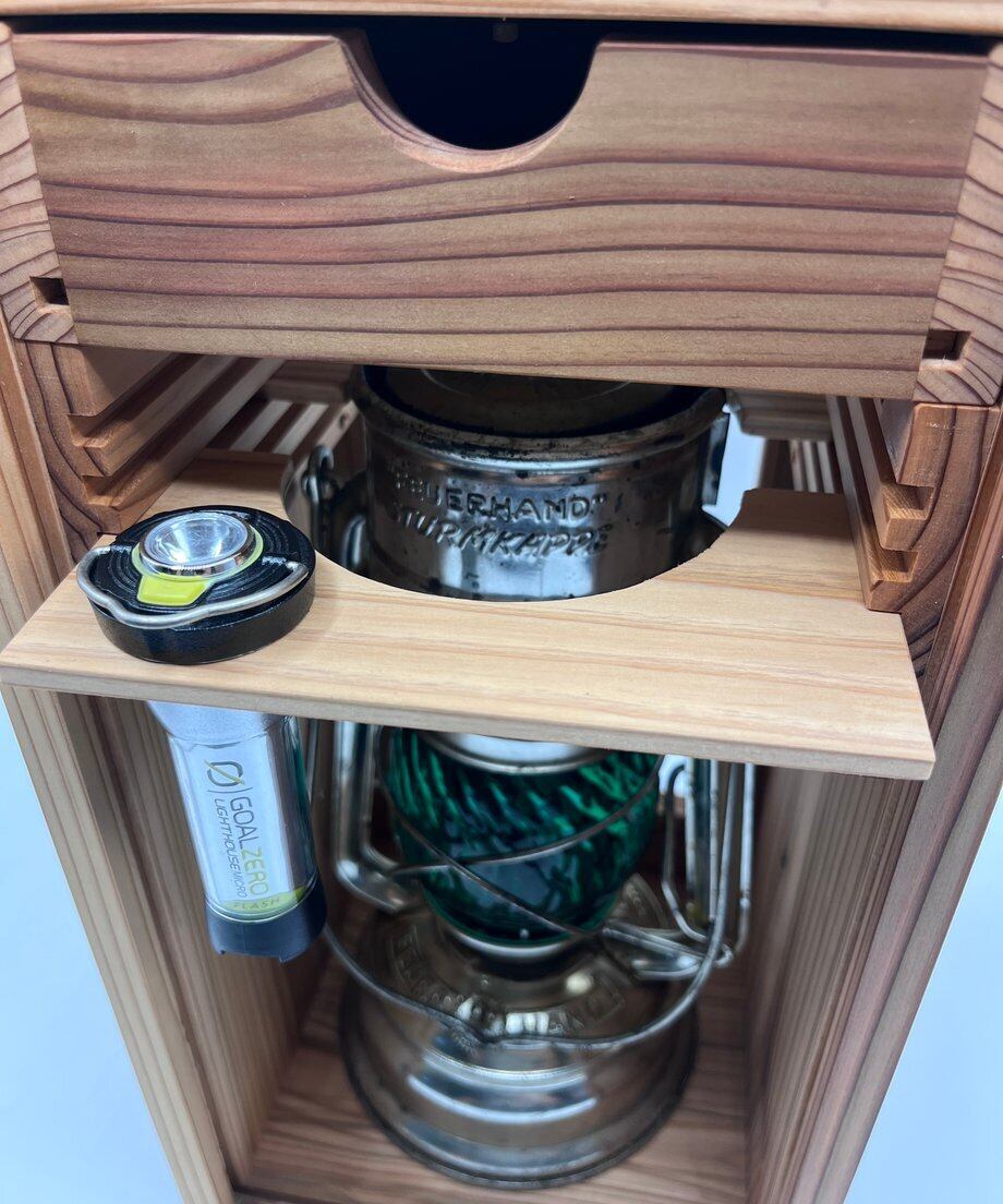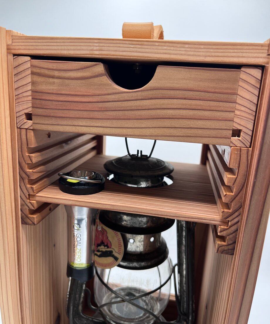 このランタンケースの特徴としてケース上部に引き出しがあります。こちらには予備の芯やライター等を格納する事ができます。