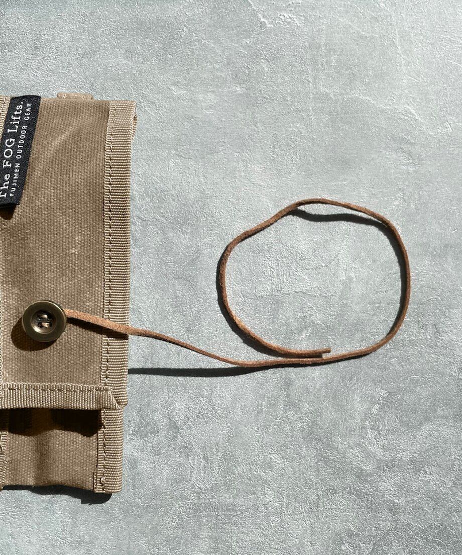 オイルマッチの雰囲気に合うパラフィン生地(蝋引き)生地を使い、ボタンに革ひもを掛けて留める仕様に。