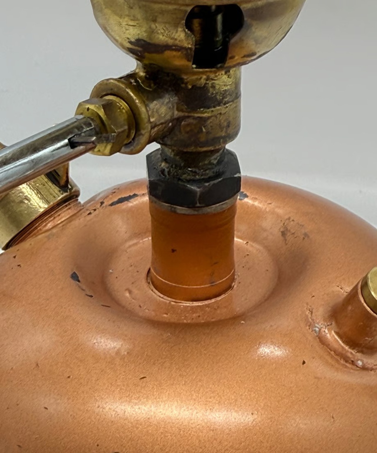 ・タンク部及びトップフードに目立つ様な傷や凹みはありません。タンク全体に小さなペイントロスが見られます。写真にてご確認下さい。タンク上部にあるアルコールカップ周辺に塗装の剥がれがみられます。これは燃焼しているアルコールの熱により発生してしまうものです。