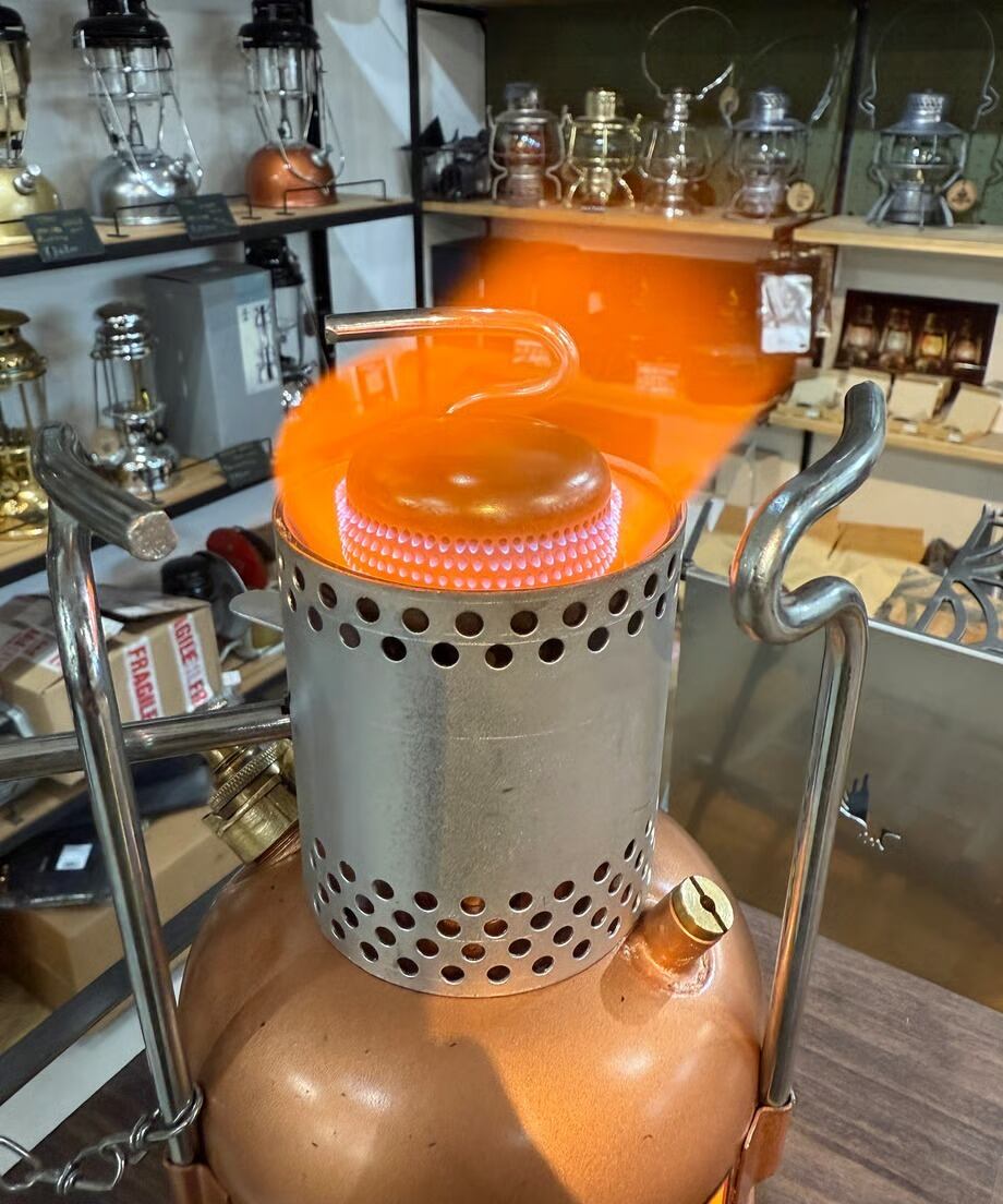 消灯方法はハンドルを右いっぱいに回すとクローズし消灯します。しっかり本体が冷えたら燃料キャップを緩めて圧抜きして下さい。ここでご注意いただきたいのは燃焼しているうちに圧抜きをしないで下さい。エアーはガス化していますから抜いているエアーに引火します。完全にバルブを右に回して消灯してから圧抜きを行いましょう。またなるべく残った燃料は抜いた方が良いと思います。