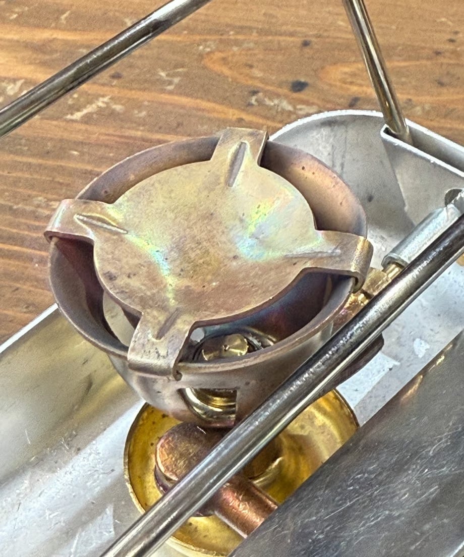 燃焼は加圧式ランタン同様プレヒートをしながら、バルブを開くと簡単に着火します。燃料はホワイトガソリンです。ランタンよりとても簡単です。