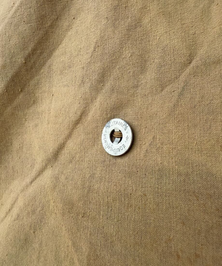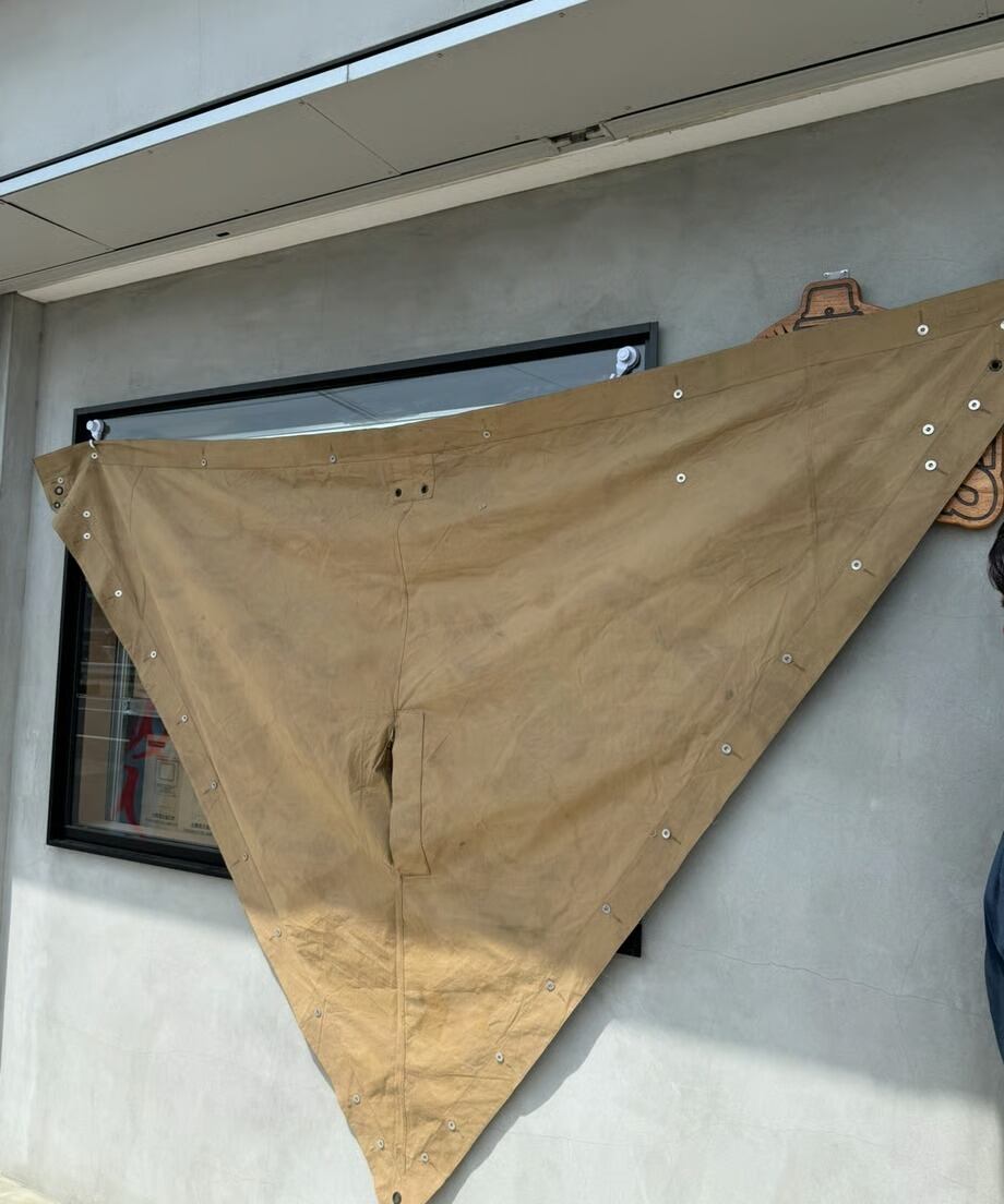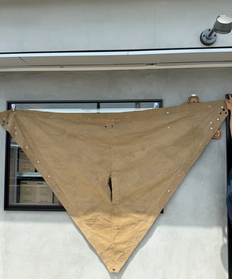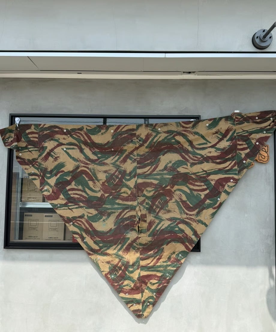 フランス軍幕は三角形の生地をボタンで繋ぎ合わせて使用します。こちらは軍幕1枚のみのバラ売りとなります。ポンチョとして使用できる様に真ん中にスリットがあります。タープや追加の幕としてご利用ください。
