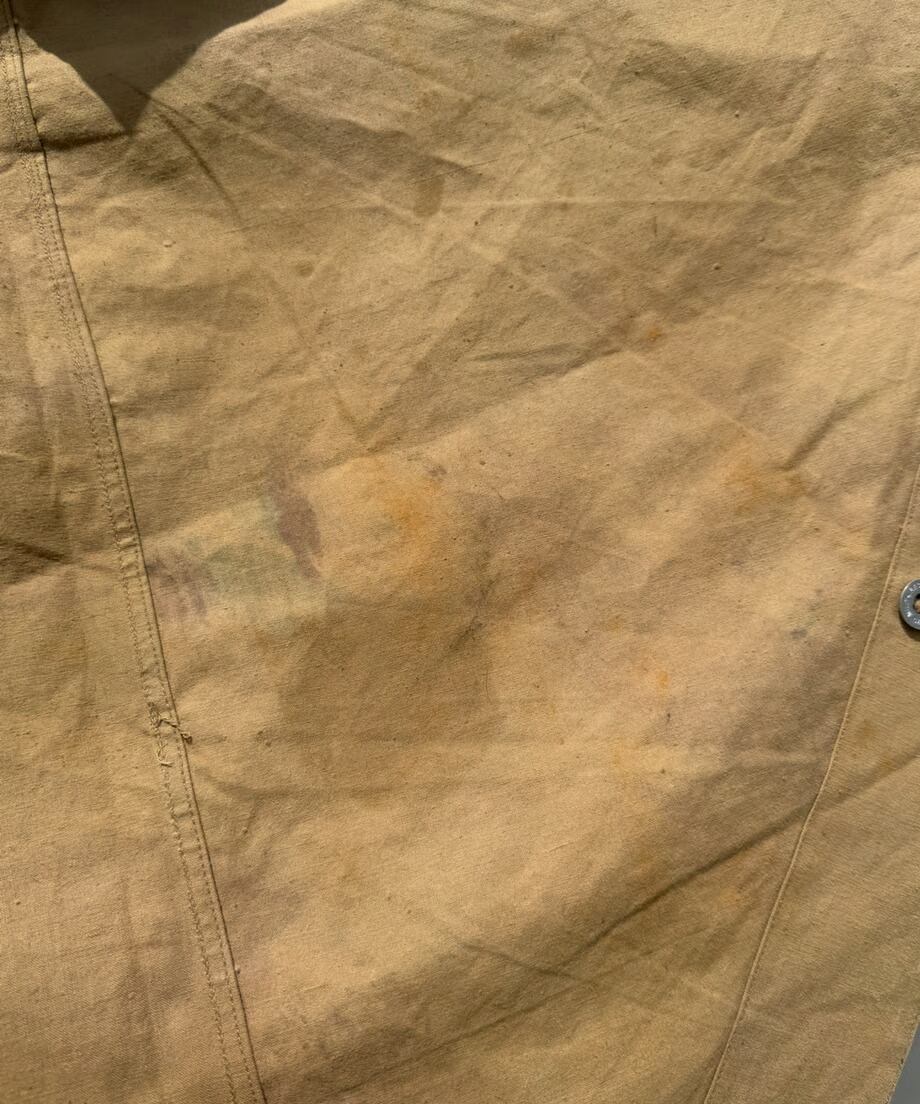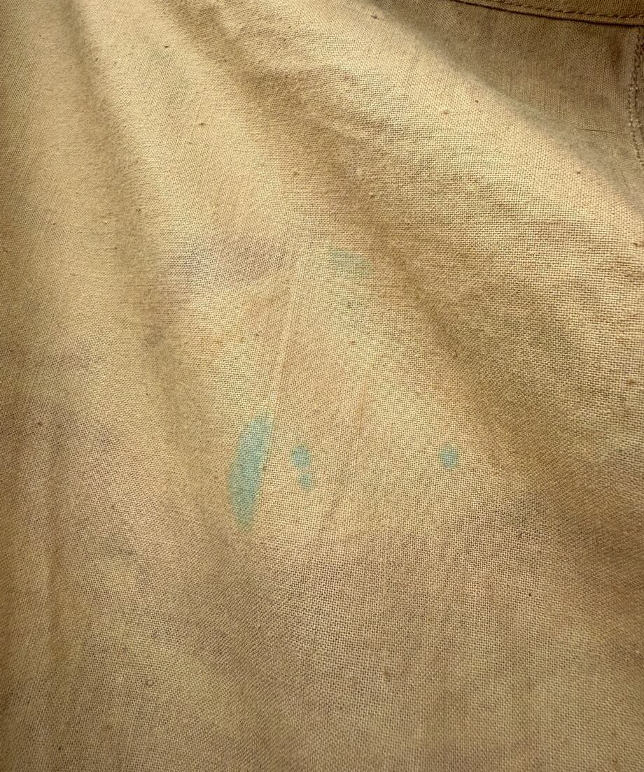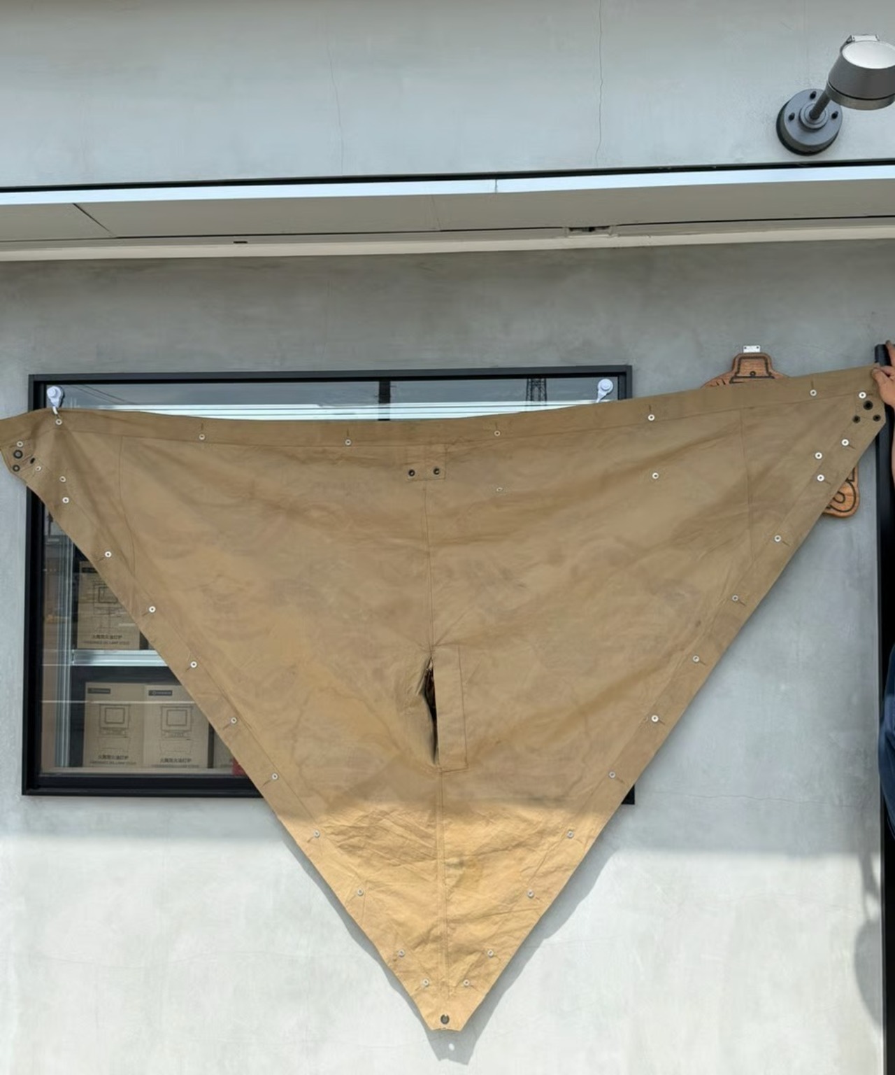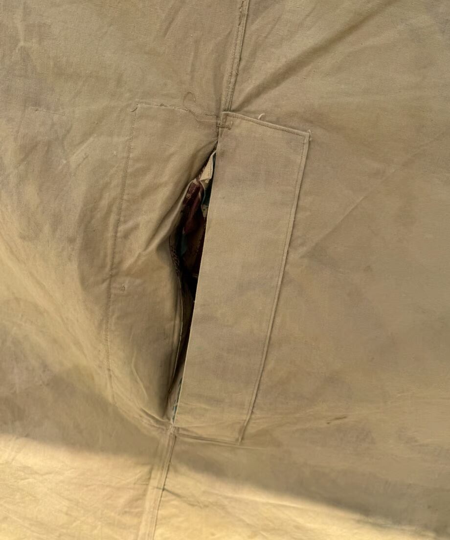 フランス軍幕は三角形の生地をボタンで繋ぎ合わせて使用します。こちらは軍幕1枚のみのバラ売りとなります。ポンチョとして使用できる様に真ん中にスリットがあります。タープや追加の幕としてご利用ください。