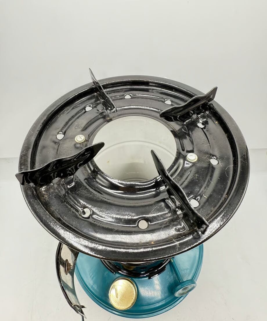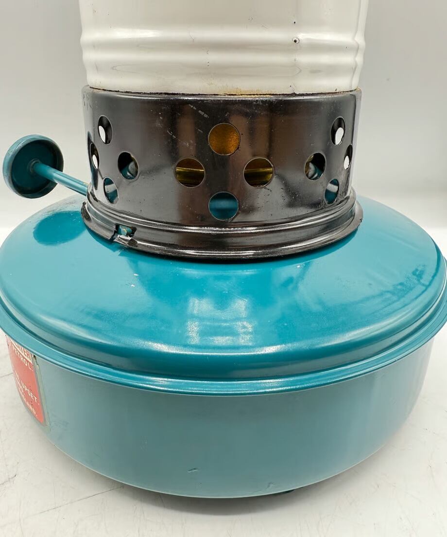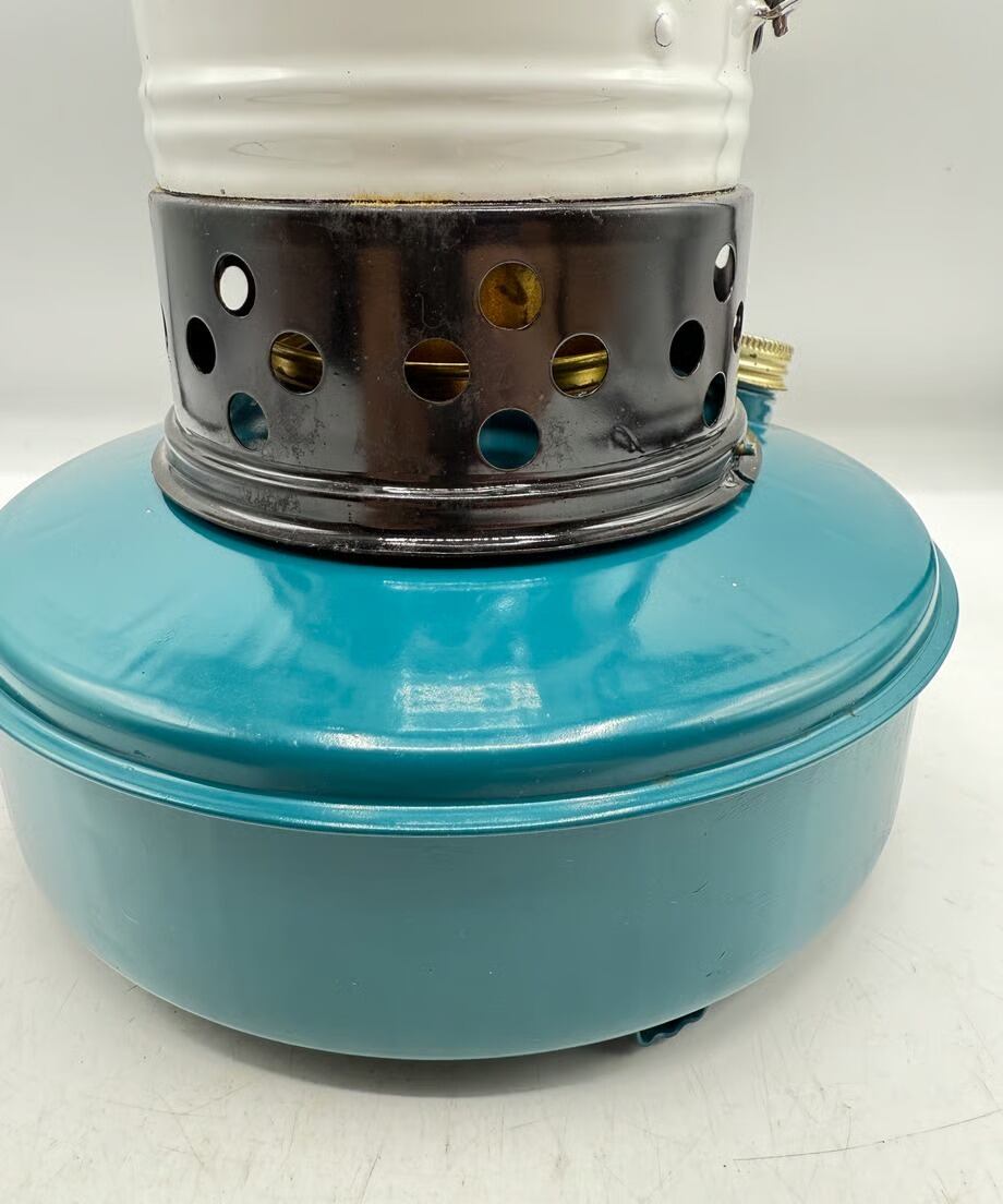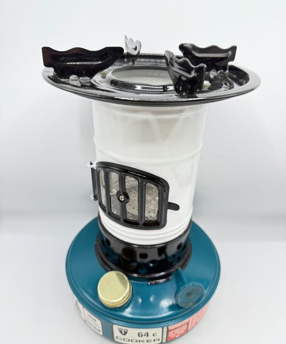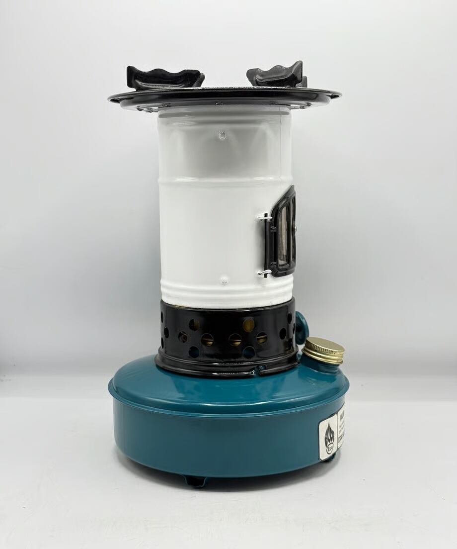 カラーはタンクがブルー色、チムニーがホワイトとブラックのツートンカラー、ビンテージらしい色合いでレトロな雰囲気です。点火した時に窓から燃える炎がとても素敵です。