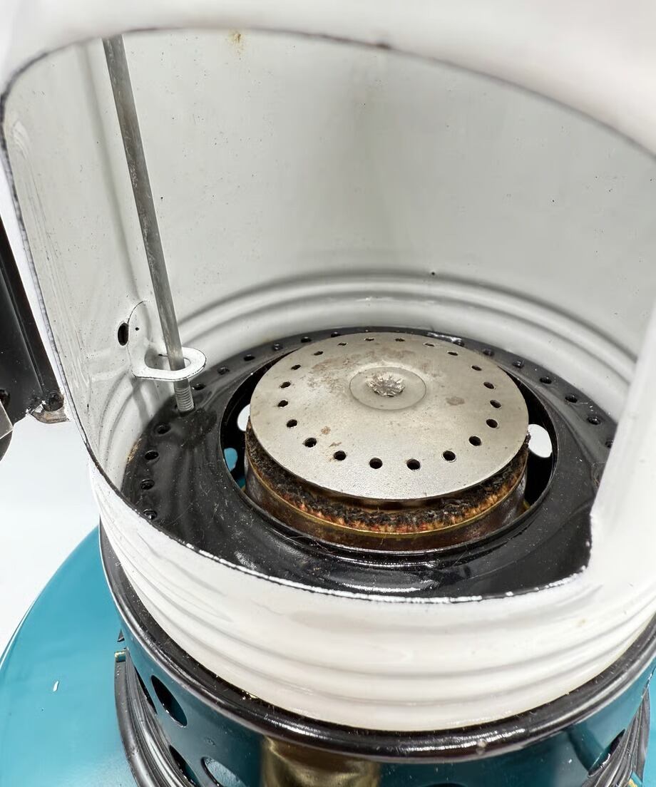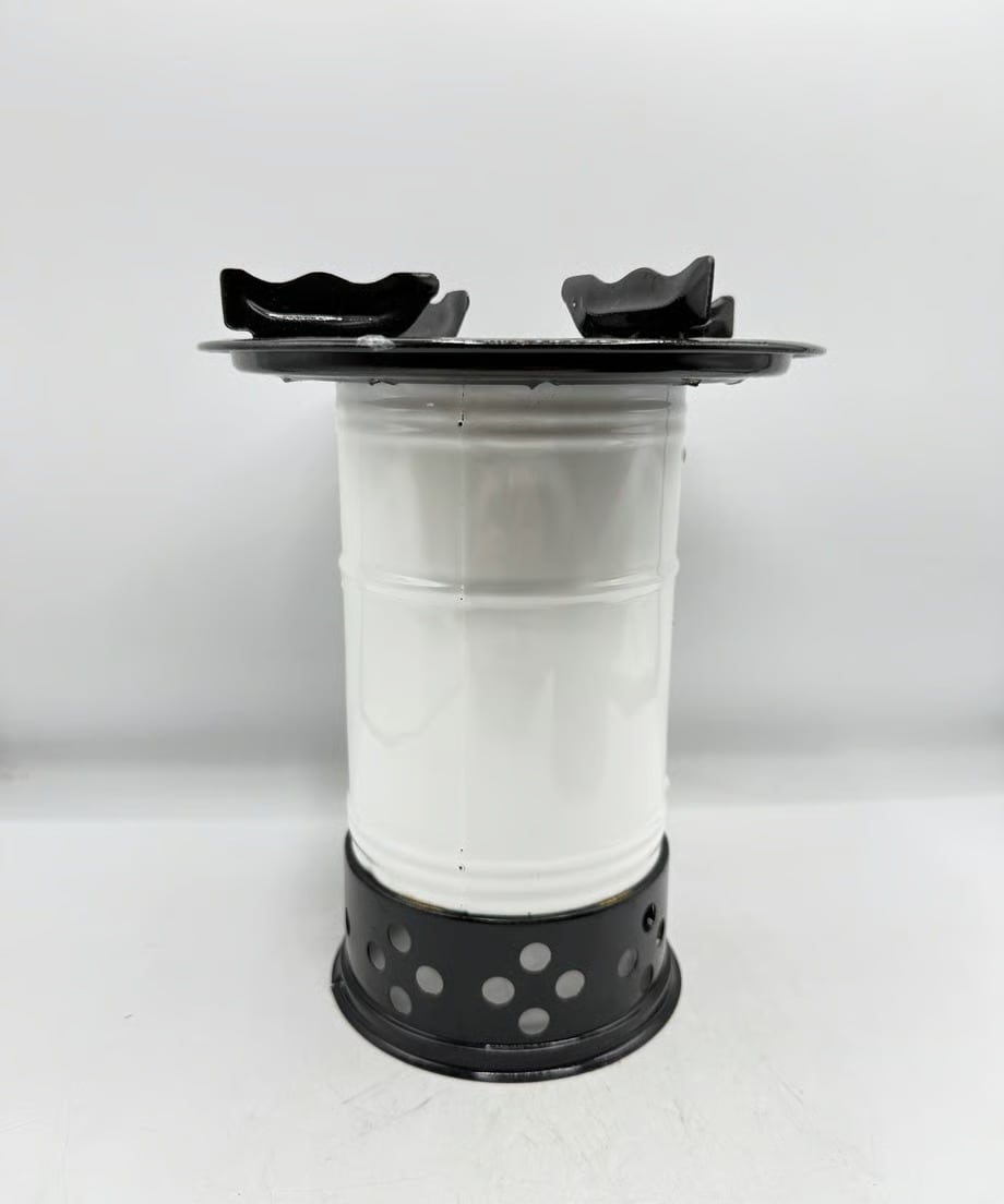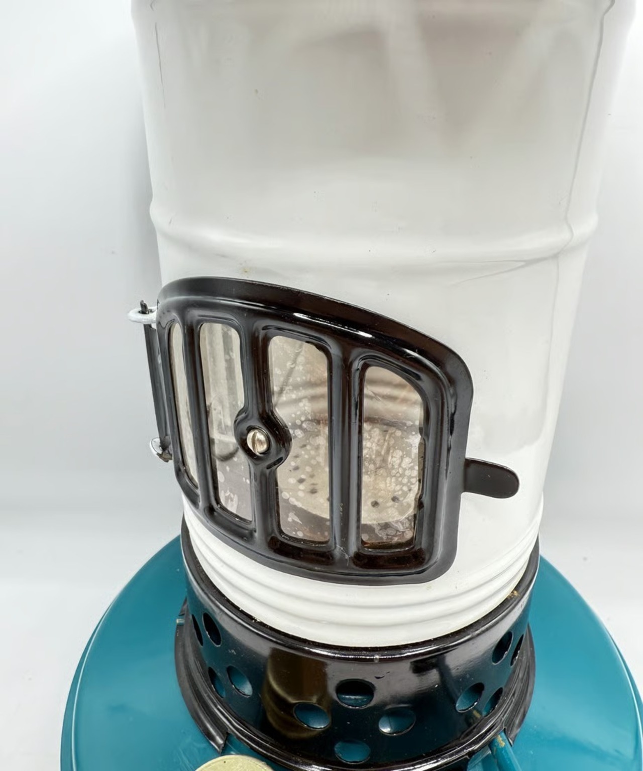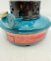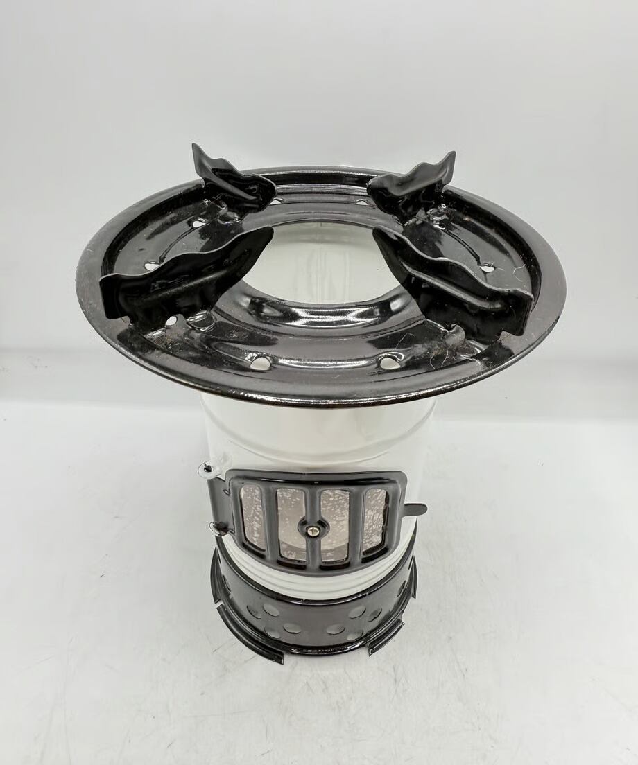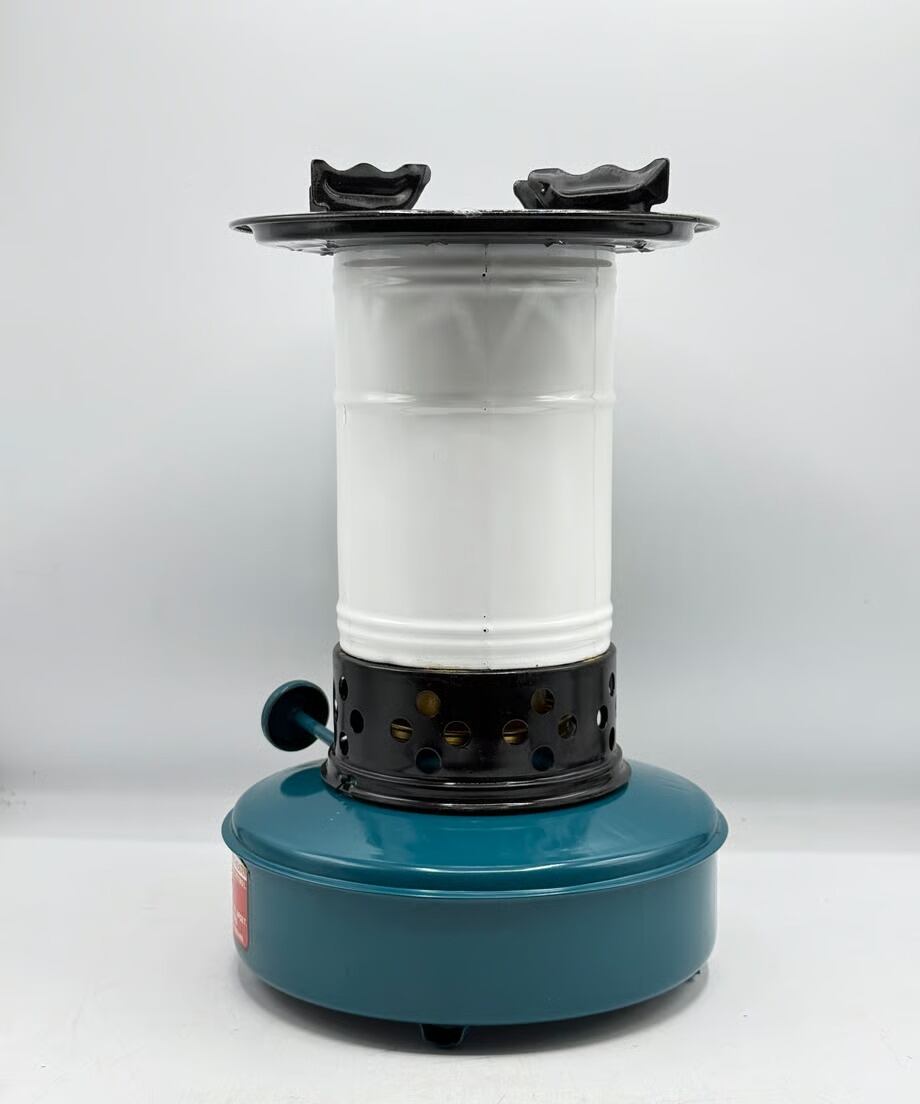 カラーはタンクがブルー色、チムニーがホワイトとブラックのツートンカラー、ビンテージらしい色合いでレトロな雰囲気です。点火した時に窓から燃える炎がとても素敵です。