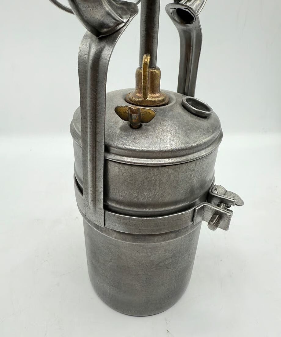 このモデルはパラフィンオイルなどな液体燃料ではなくカーバイドを燃料としたランタンです。タンクは上下に二分室あって上部に水、下部にカーバイドを入れてしっかりと栓をします。少しづつバルブを緩めて水をカーバイドに注入していきます。しばらくするとガスが発生してきますので、そこに着火します。とても可愛い炎が燃料します。水を滴らせてもすぐにガスにはなりませんので、しばらくするとガスが噴出しますので、すぐにガスが噴出しないからといって水を大量に滴らせるのはNGです。少しづつ水は滴らせてあげて下さい。