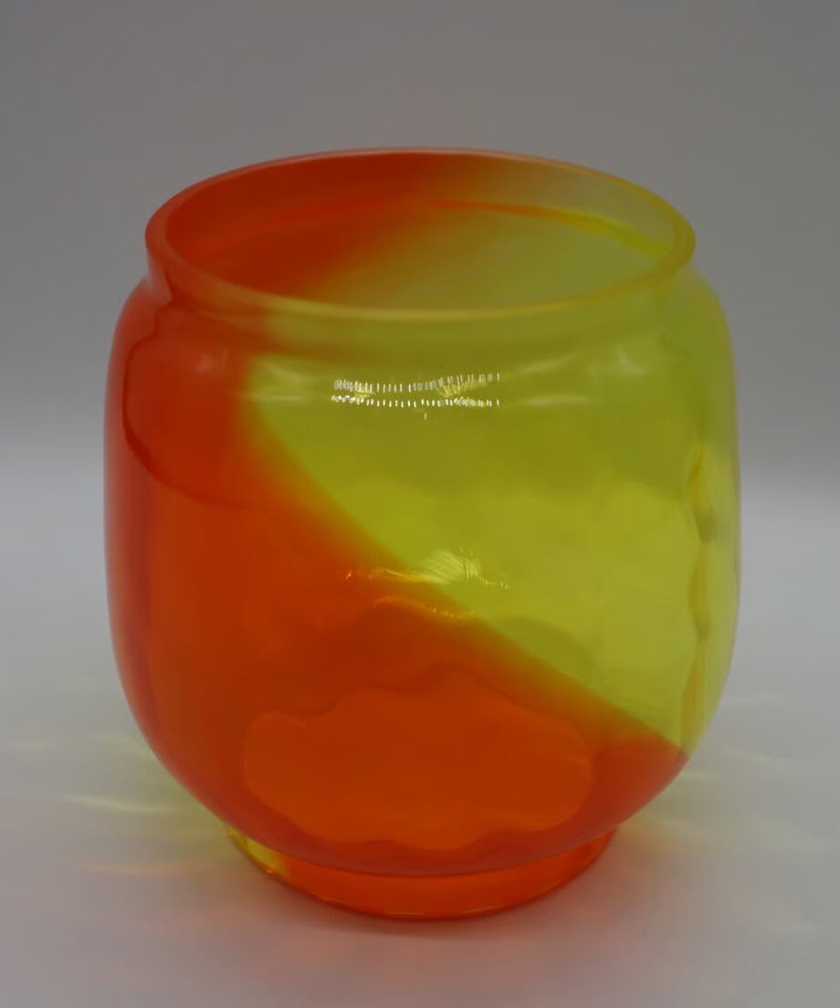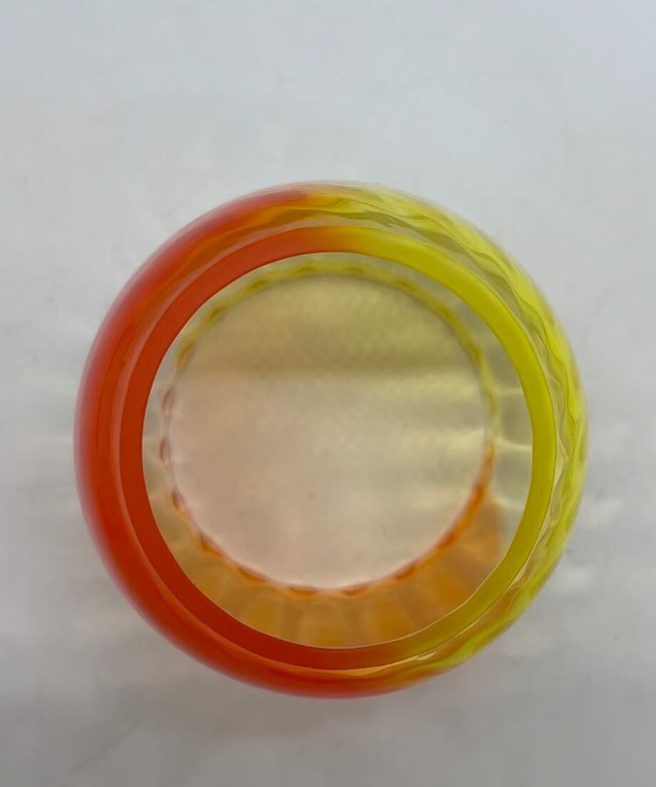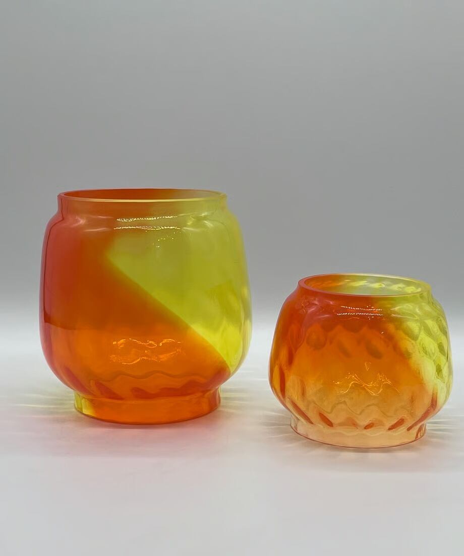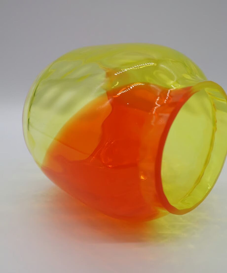 イエローとオレンジ2色を使った作品です。他カラーの中で最も明るい為、夜間点灯するとランタンを置いたテーブルにガラスと同じくイエローとオレンジ色に染まります。