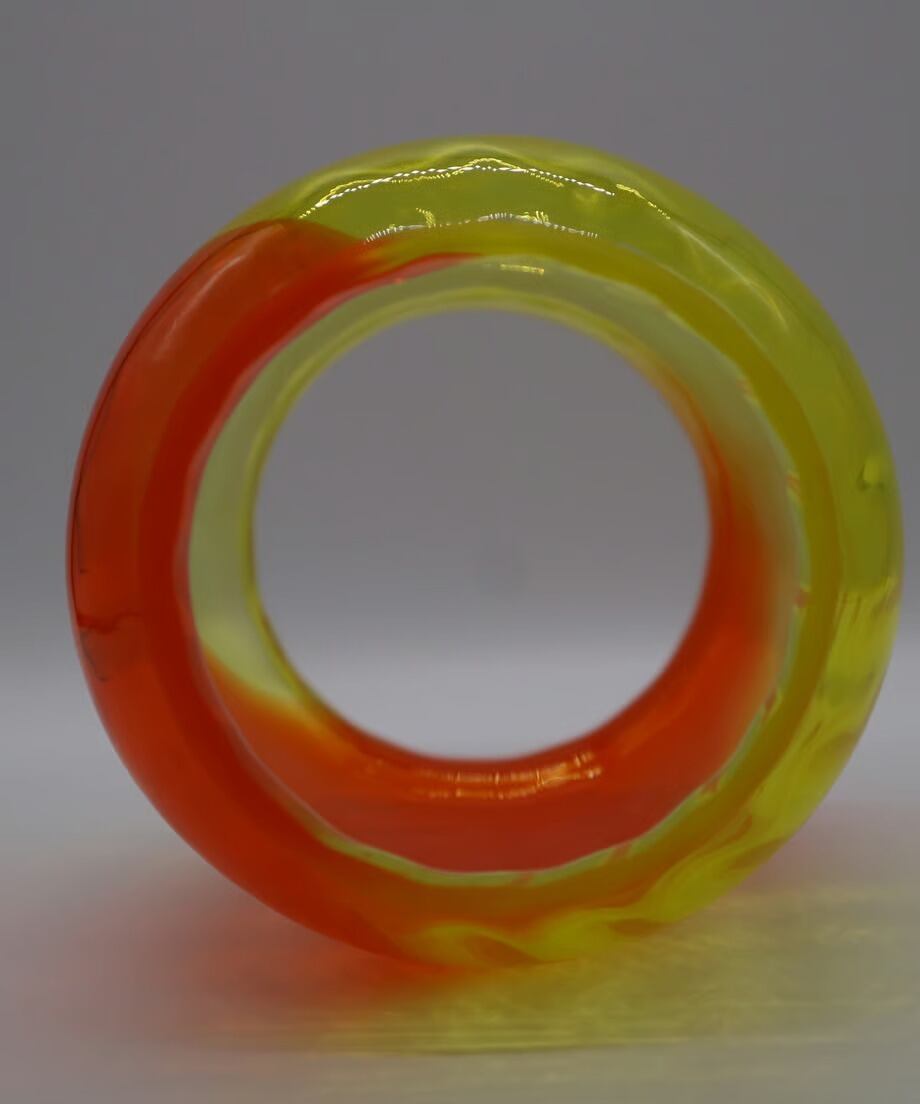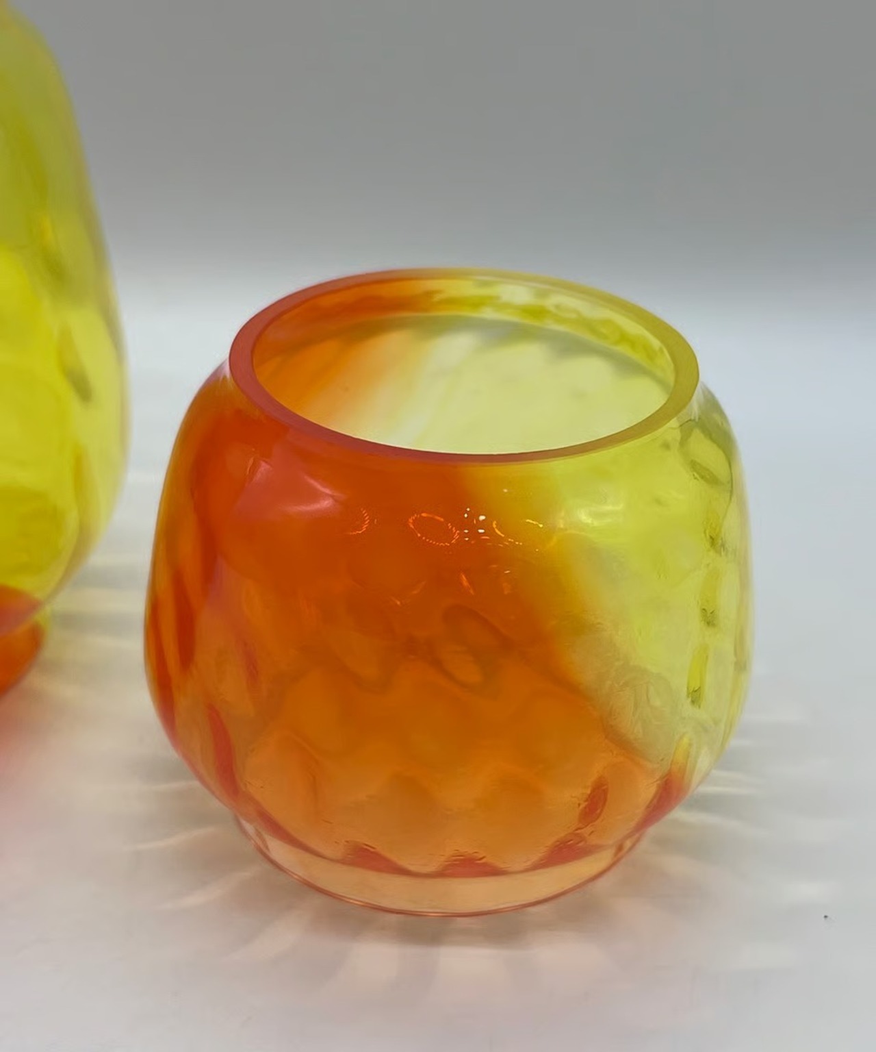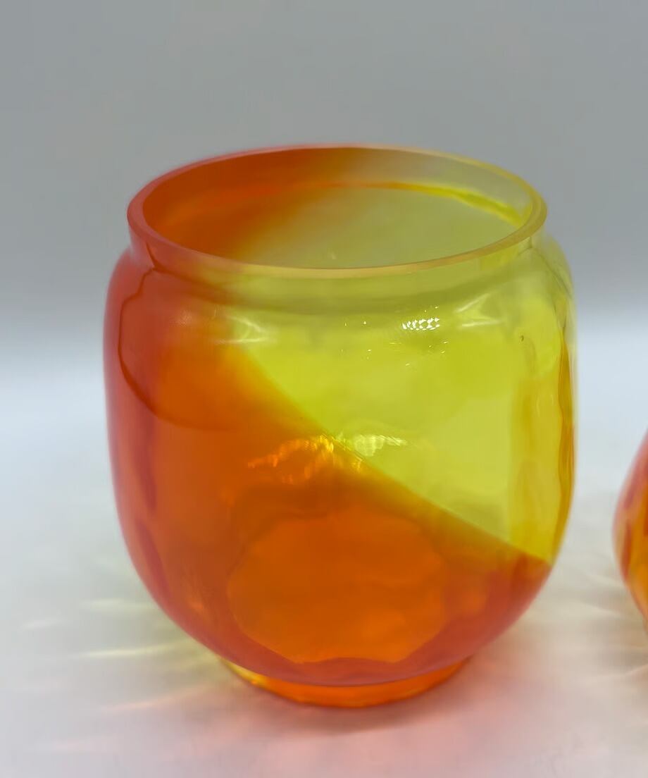 イエローとオレンジ2色を使った作品です。他カラーの中で最も明るい為、夜間点灯するとランタンを置いたテーブルにガラスと同じくイエローとオレンジ色に染まります。