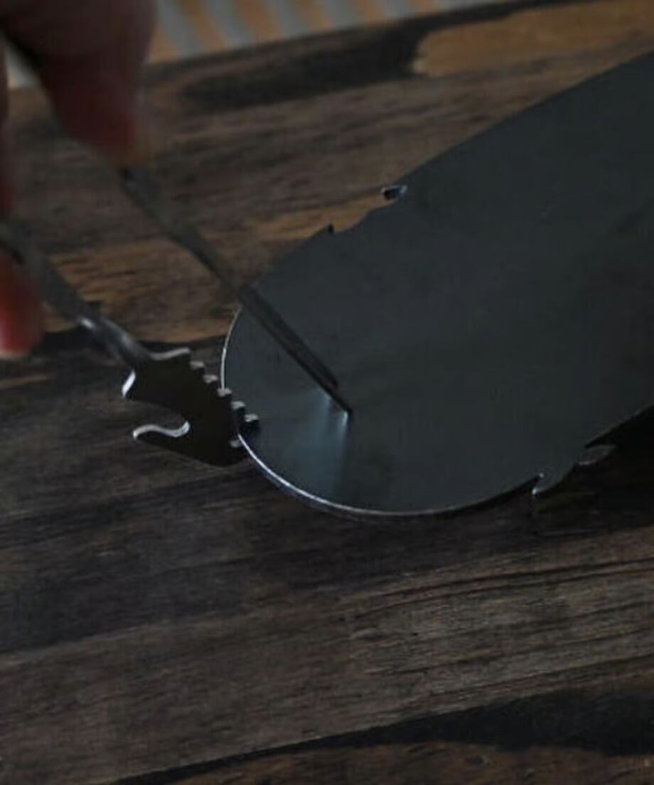 先端のツノみたいなスリット。 アツアツの飯盒の吊り手に引っ掛けて持ち上げられます。