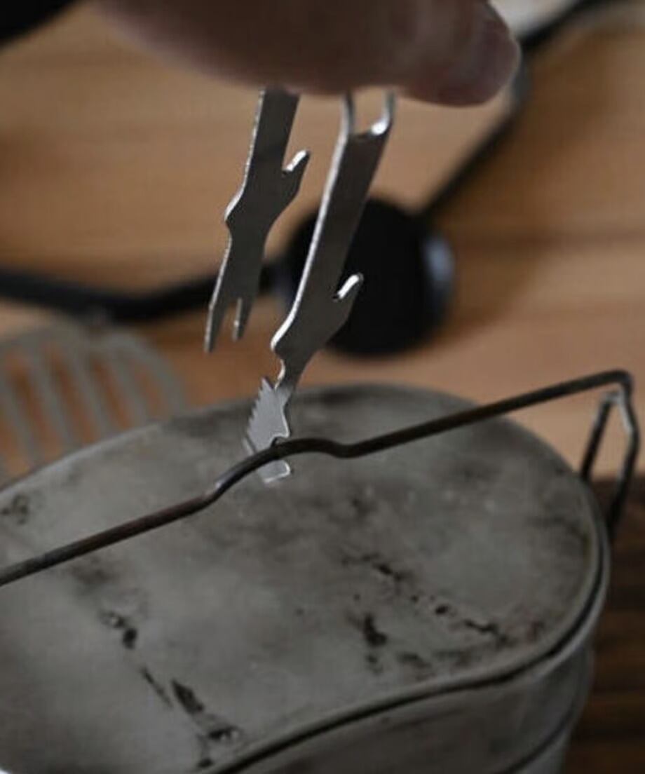 飯盒トングの全長は中子に入るサイズで約15.5cm程。トング先端がテーブルにつかない様に中間の丸い部分が仕事をしてくれます。 色々なアクションが出来る多機能なトング。戦闘飯盒2型の中にも入る大きさです。是非とも飯盒ファンに使って貰えると幸いです。
