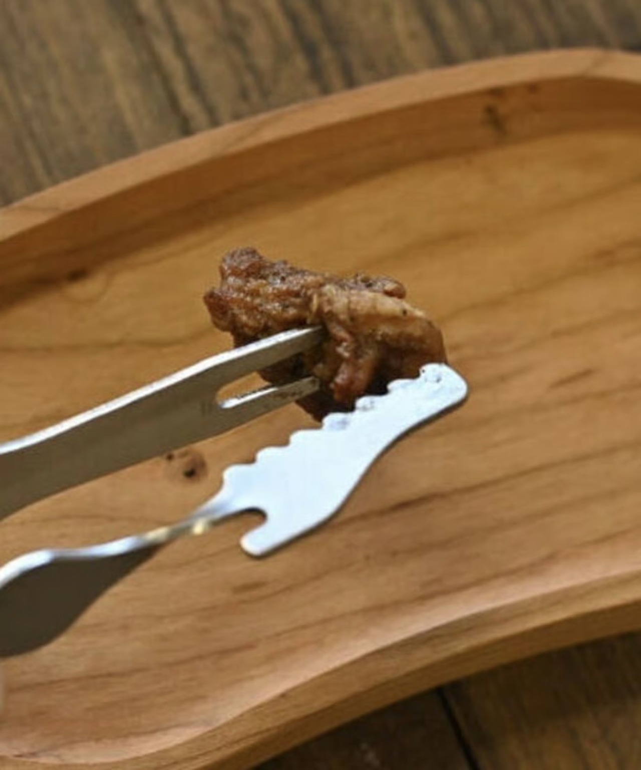 フォークの反対側は丸みを帯びたギザギザ。肉などをつかむこと出来ます。カスタマイズでフォーク部分の先端をちょっと曲げればトング機能が向上します。 ギザギザが丸みを帯びてるのはスポンジで洗う時にボロボロにしない為です。