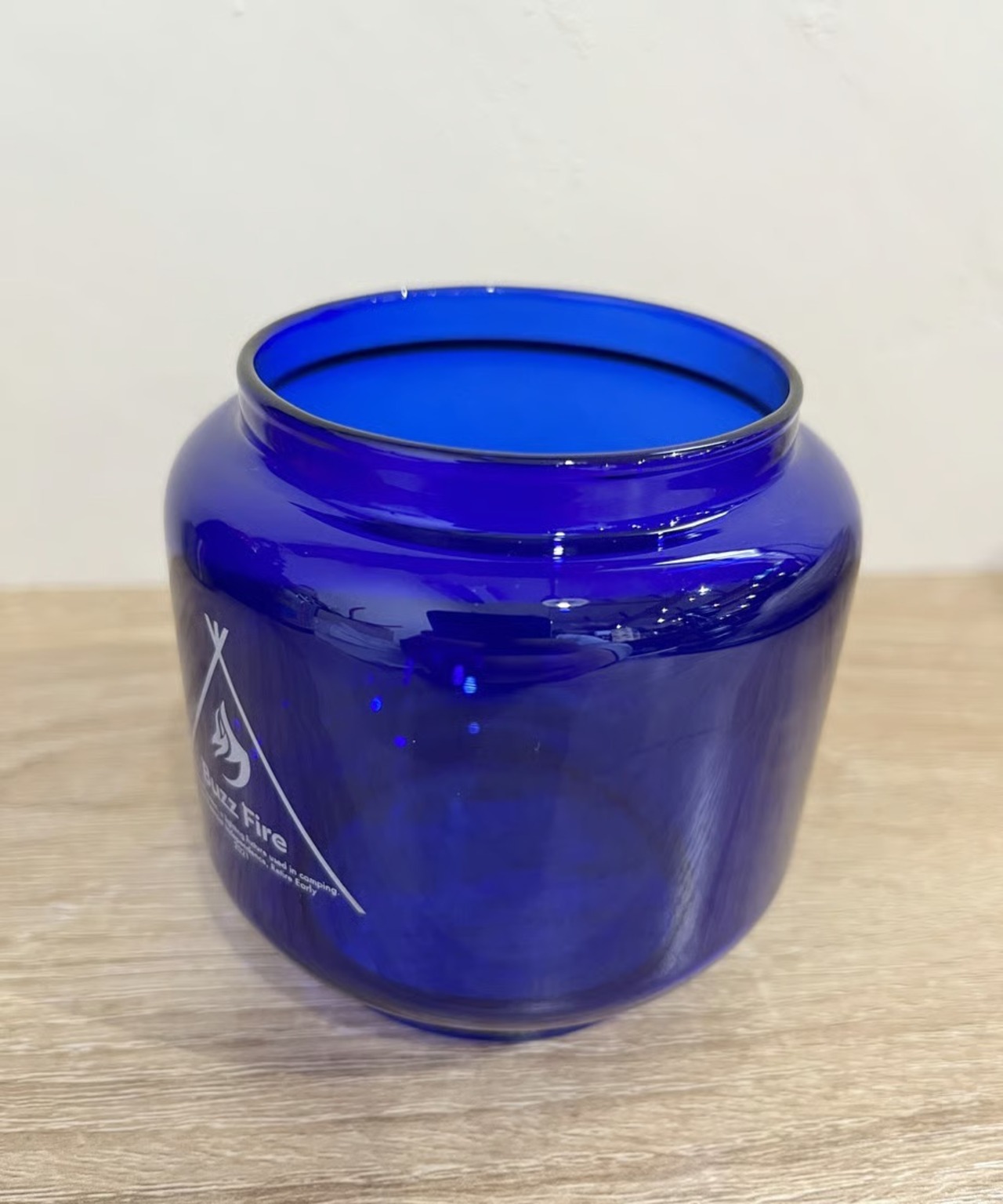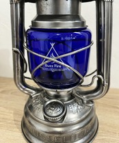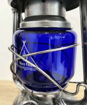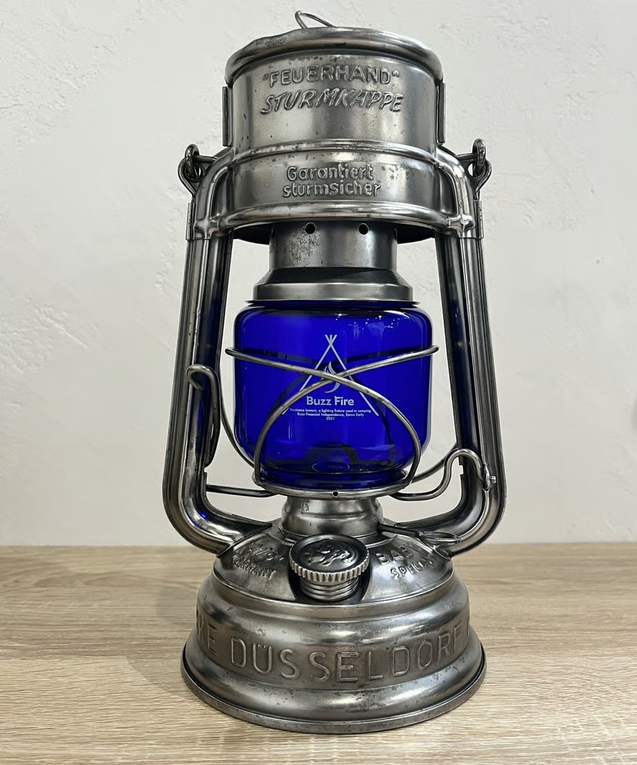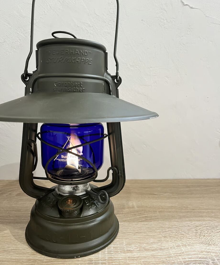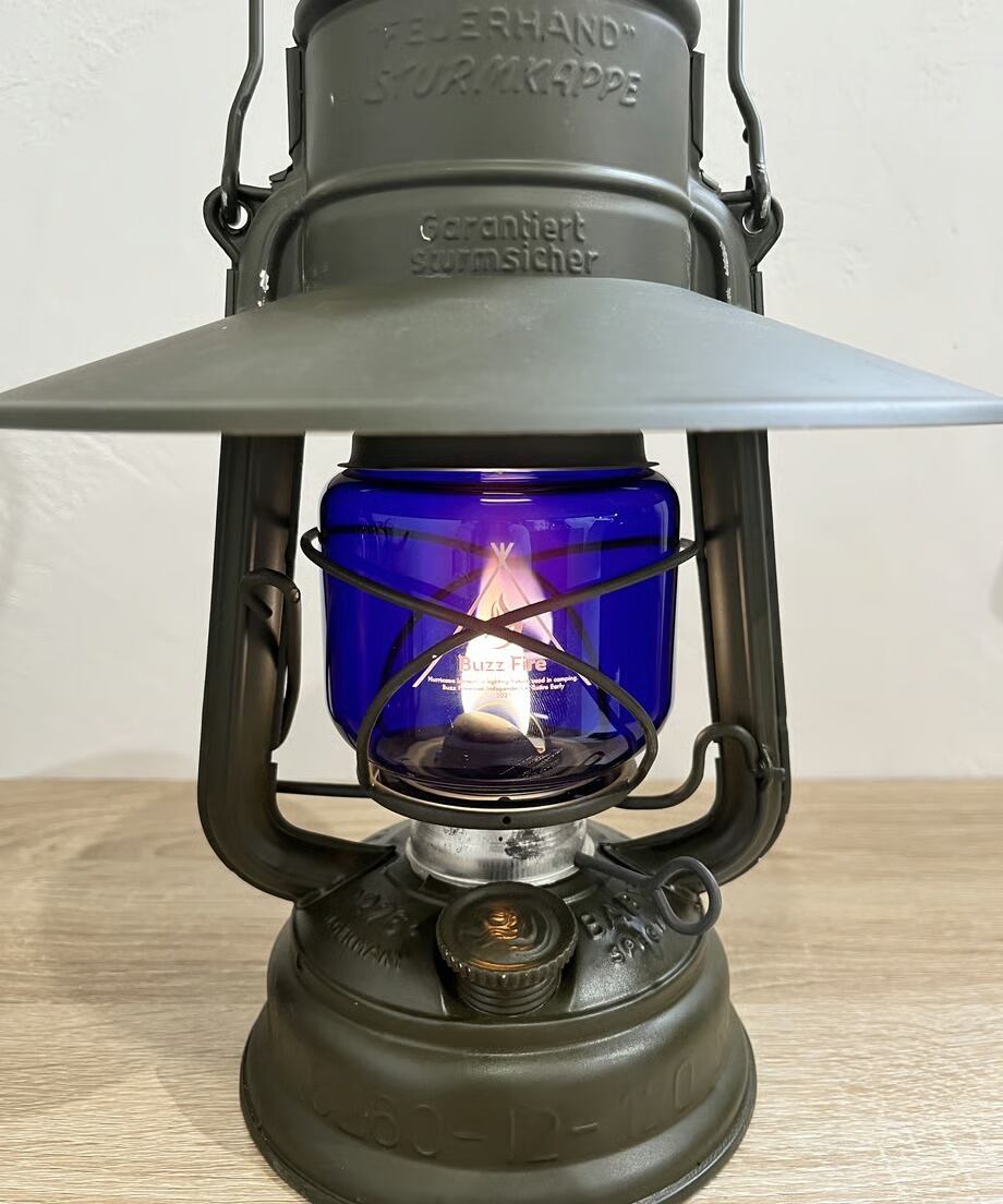 点灯すると炎が青白くなります。オリジナルのFEUERHANDにもその昔ブルーカラーは存在しました。逆にアンバーは無いと思います。戦時中のドイツでは灯りが敵国に漏れないように極暗いガラスが使われました。ブラックもありますが、このブルーもあり、現在では大変貴重で高価です。そんな時代のブルーカラーを彷彿とさせる今回のカスタムブルーグローブ。